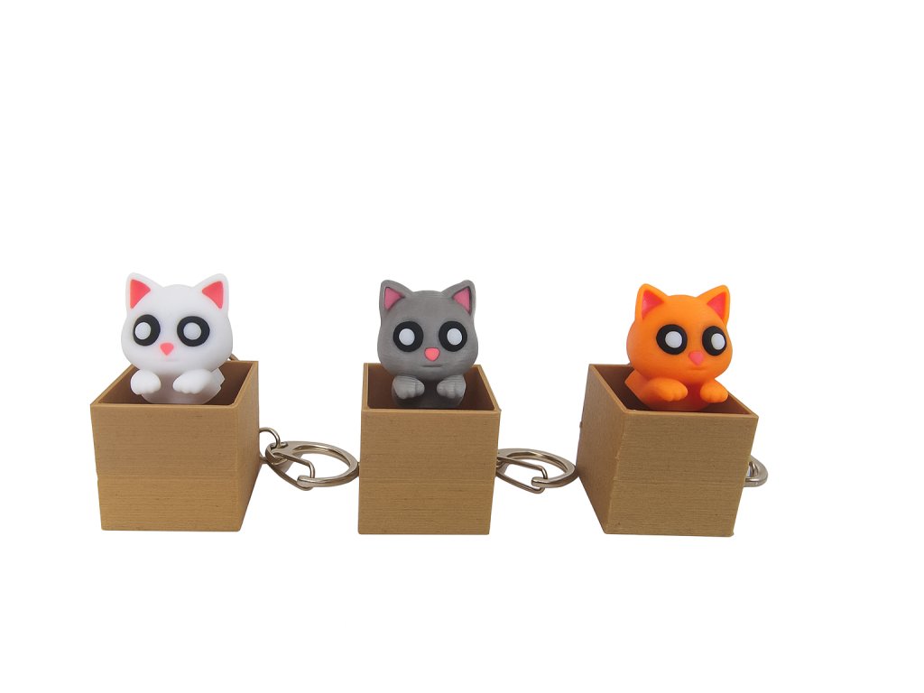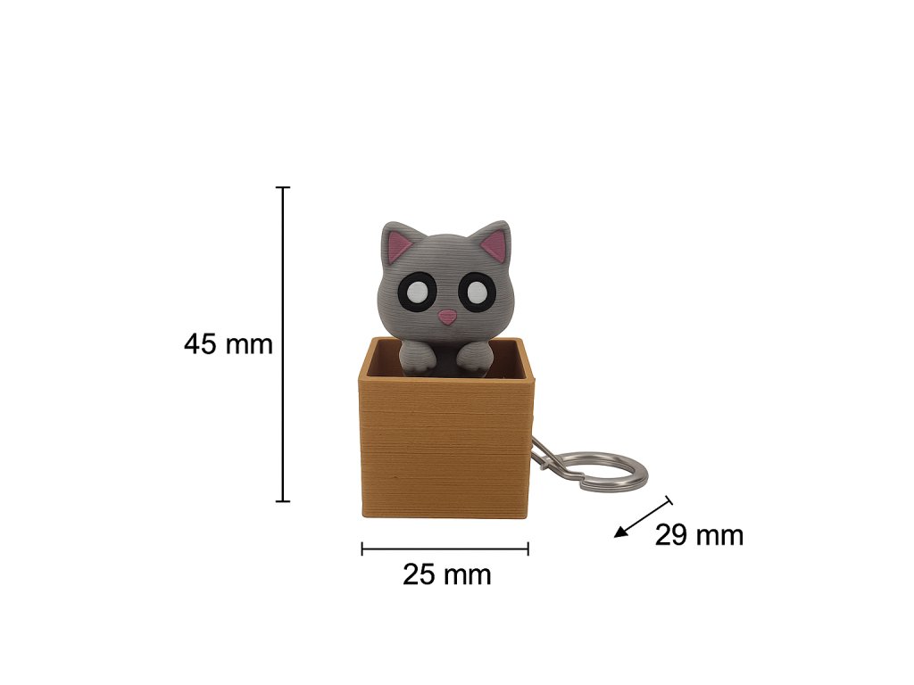 Roztomilá klíčenka s malou kočičkou vykukující z dřevěné krabičky, vytištěná pomocí 3D tiskárny nejnovější generace z ekologického PLA plastu.